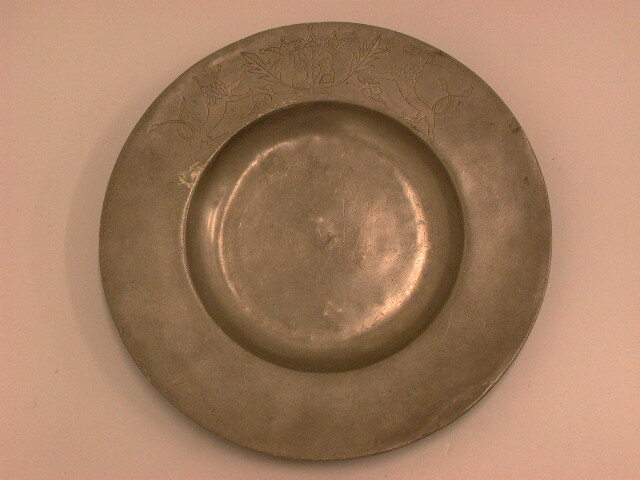 - BeschrijvingHollands. Op voorzijde in de rand een gravering: twee Hebreeuwse letters onder een kroon, gevat tussen twee palmtakken en geflankeerd door twee leeuwen. In de achterzijde van de rand zijn de letters ME en HE gekrast. Op de onderzijde in witte verf het oude inv.nr. 89.