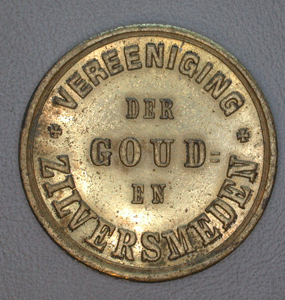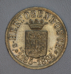 Voorzijde: Gekroond wapen van 's-Hertogenbosch. Omschrift 's-Hertogenbosch * 1185 - 1885. Keerzijde: Opschrift: * VEREENIGING/DER/GOUD=EN/ZILVERSMEDEN* Deze penningen werden verkrijgbaar gesteld tijdens de historische optocht ter gelegenheid van het 700 jarig bestaan van 's-Hertogenbosch op 20 juli 1885. Slechts 5 bronzen exemplaren. Zie ook inv.nrs. 4169 (brons) 4170 en 7042 (tin) 7164 (tin, verguld) 7165 (lood of tin)