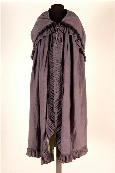 - BeschrijvingLichtpaarse bedrukte katoen. Kap en mantel afgezet met geplisseerde stroken van dezelfde stof. Kap nog omrand met zwarte machinale kant. Witte katoenen voering. Handgenaaid.