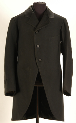 - BeschrijvingZwarte wollen jas. Kleine revers, hooggesloten. Sterk schuin weggesneden voorpanden. Split middenachter. Steekzakje op linker voorpand op borsthoogte en klein steekzakje in rechter voorpand in taillenaad. Gevoerd met zwarte satijn.