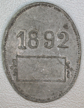 - BeschrijvingOvale penning zonder gat in het midden. Vz: Gekroond stadswapen om het geheel een parelrand Kz: In hoog reliƫf het jaartal 1892 daaronder een kader waarin het nummer diende te worden ingeslagen. Om het geheel een parelrand.