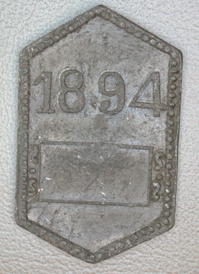 Zeshoekige penning waarvan de verticale zijden langer zijn dan de overige zijden. Zonder gat in het midden. Vz: Gekroond stadswapen midden boven een parelcirkeltje ter aanduiding van het gat voor de ring. Om het geheel een parelrand. Kz: In hoog reliƫf het jaartal 1894. Daaronder een kader waarin het nr. dient te worden ingeslagen. Om het geheel een parelrand