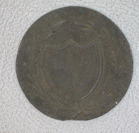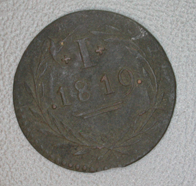 - BeschrijvingVz: Ovaal schild, omgeven door lauwertakken. Om het geheel een parelrand Kz: Het opschrift +I+/.1819. Daaronder een dubbele streep. Daaromheen lauwertakken. Om het geheel een parelrand