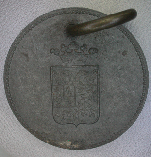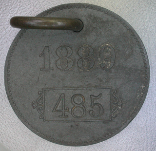 - BeschrijvingRonde penning met gat en ring Vz: Gekroond stadswapen om het geheel een parelrand Kz: jaartal 1889 in hoog reliƫf, daaronder is in een kader het nummer 485 ingeslagen. Om het geheel een parelrand