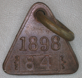 - BeschrijvingDriehoekige penning met gat en ring Vz: Gekroond stadswapen, geflankeerd door rankenmotieven. Om het geheel een doorlopende rand Kz: In hoog reliƫf het jaartal 1898 daaronder is in een kader het nummer 84 ingeslagen. Om het geheel een doorlopende rand