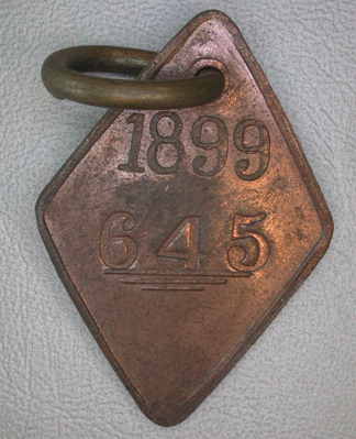 - BeschrijvingRuitvormige penning met en ring Vz: Gekroond stadswapen om het geheel een doorlopende rand Kz: In hoog reliƫf het jaartal 1899 daaronder ingeslagen het nummer 645 Om het geheel een getrokken rand