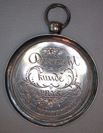 Ronde penning met knop en ring. Brede,platte rand met een verdiept veld, door een profiel omsloten. Voorstelling vz in hoog reliëf Vz: Zittende muze met lauwerkrans in de gestrekte rechterhand de linker leunend op een piédestal met het Nederlandse wapen. In de linkerhand houdt zij een hoorn des overvloeds, aan haar voeten liggen een passer
