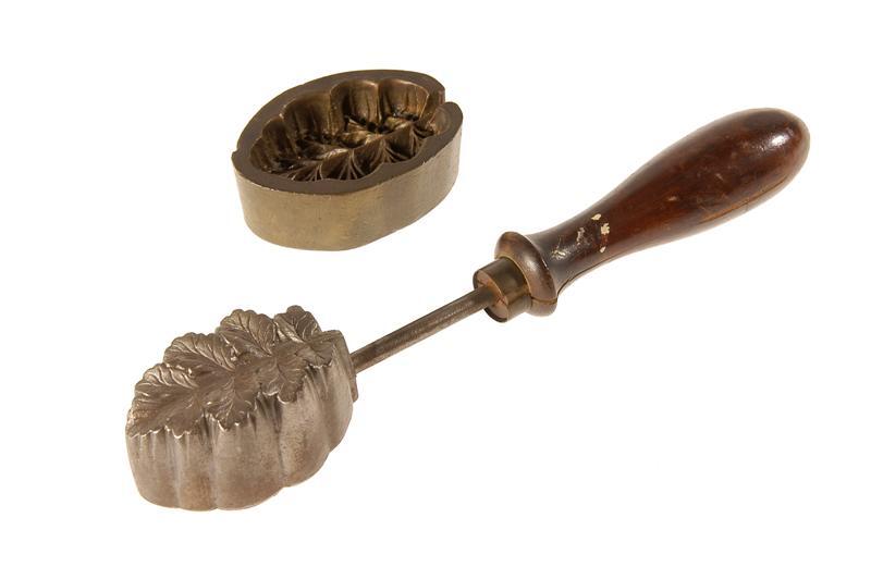 - BeschrijvingVoor het in model persen van bloemen en blaadjes zoals bij poffers, hoeden enz. Gietijzeren mallen met messing contramallen. Fantasiemotief (bloemblad?). Met blank houten heft.
