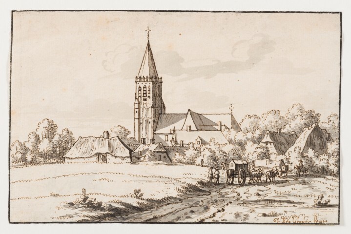In verso een detail van het dak van de kerk, eveneens in bruine pen en grijs penseel in loodstift (ander handschrift: "Boxmeer in de Baronye van Cuyk/ 16 11/9 75". In bruine pen (authentiek): "de spits van de Toore moet wat smalder sijn:". De datum in verso heeft waarschijnlijk betrekking op een origineel, waarvan deze tekening dan een tweede versie is. Het tafereel doet veel te zomers aan voor november.