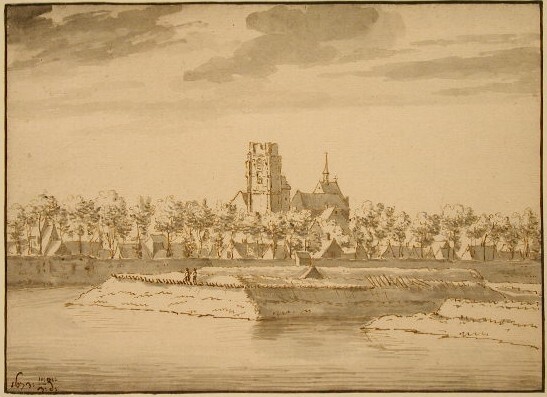 - BeschrijvingLinksonder in de tekening in bruine pen: "1673: 11:m:/3:d:". In verso in potlood (niet eigenhandig): "De stadt Geertruydenberg" en "1107". De datum heeft waarschijnlijk betrekking op een origineel, waarvan deze tekening dan een tweede versie is. Het tafereel doet veel te zomers aan voor november.