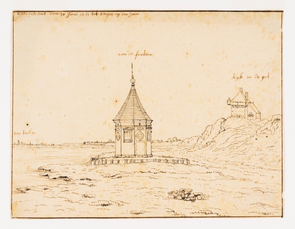 Linksboven in de tekening in ruine pen: "getekent den. 30 Juni 1671 tot bergen op den Zoom". In de tekening van links naar rechts: "ter toolen", "aen de fontein" en "kijk in de pot". In verso in potlood (niet eigenhandig): "Fo 149" en "285". In paars het stempel "Provinciaal Genootschap van/ Kunsten en Wetenschappen/ in Noordbrabant/ 'sHERTOGENBOSCH".