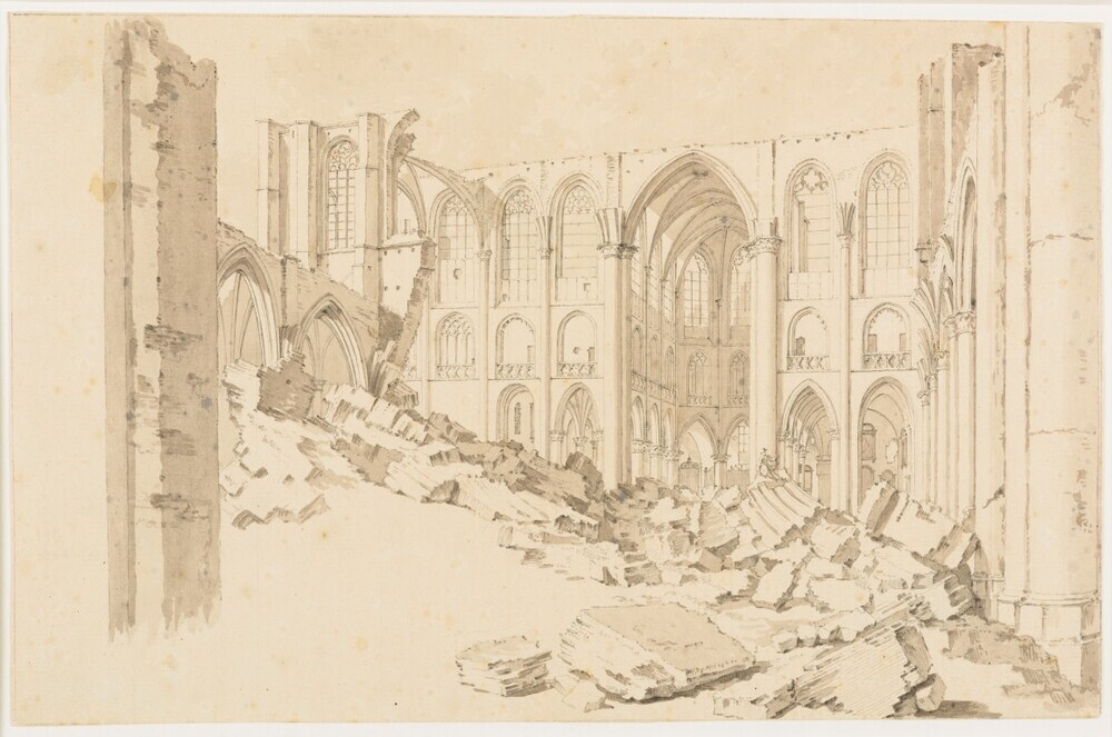 In verso in bruine pen (niet eigenhandig): "Guillot" in potlood (niet eigenhandig): "261". Op een bijgevoegde losse strook, die vermoedelijk van het blad is afgesneden, in grijze pen in het handschrift van Pronk: "Vertooning der Geruineerde Kerk en Puynhoopen Ziende van den Toren na 't Choor".