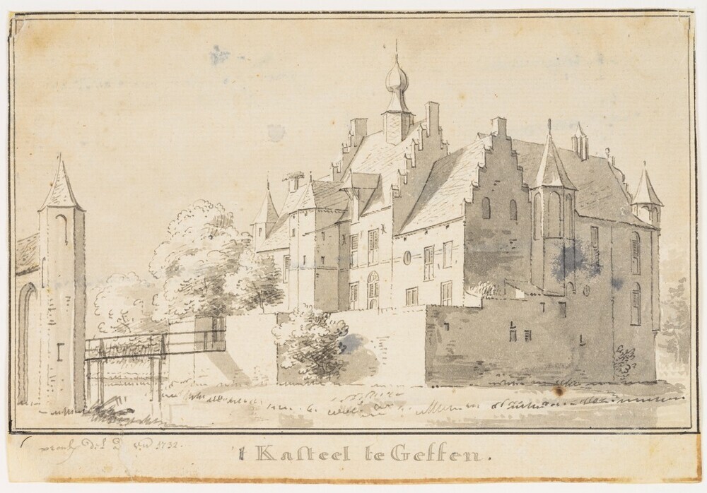 - BeschrijvingMiddenonder de tekening in grijze pen: "'t Kasteel te Geffen".