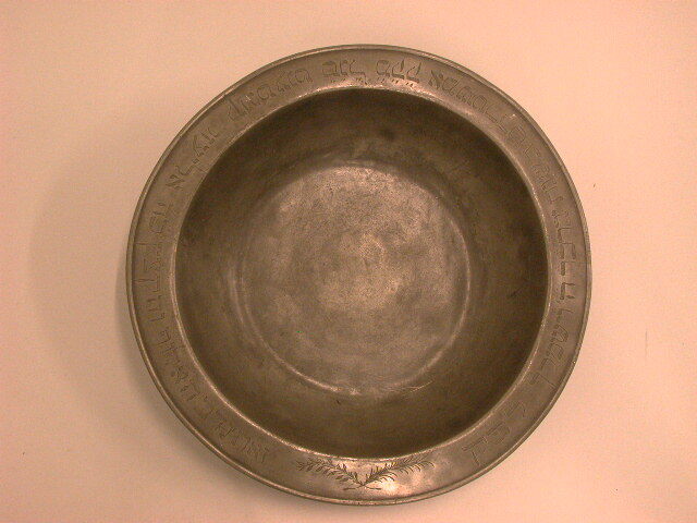 Diepe tinnen kom met smalle rand aan uiteinde verdikt. Aan de buitenwand is er duidelijk een spiraal te zien van het bijdraaien. Op de rand een inscriptie in Hebreeuwse letters en twee gekruiste takken.