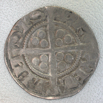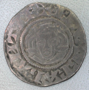 - BeschrijvingVz: Een gekroond portret 'en face' tussen twee parelranden een omschrift. Kz: Een lang gevoet kruis dat de binnenste parelrand doorsnijdt. In de kwartieren viermaal drie bolletjes. Tussen twee parelranden een omschrift.