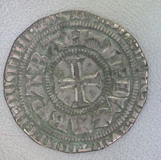 - BeschrijvingVz: Gekwartierd wapenschild met de leeuwen van Brabant en Limburg. Tussen twee parelranden een krans van twaalf fleurs de lis. Kz: Binnen een parelrand een kort gevoet kruis. Daaromheen twee concentrische omschrifte, door parelranden van elkaar gescheiden.