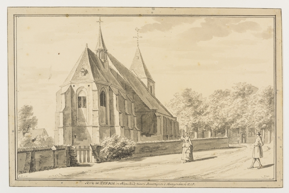 - BeschrijvingDe kerk te Heesch gezien vanuit het noordoosten. Onderschrift: Kerk tot HEESCH in Maasland tussen Ravesteijn en 's-Hertogenbosch 1729. Op achterzijde: 2703 en stempel Provinciaal Genootschap.