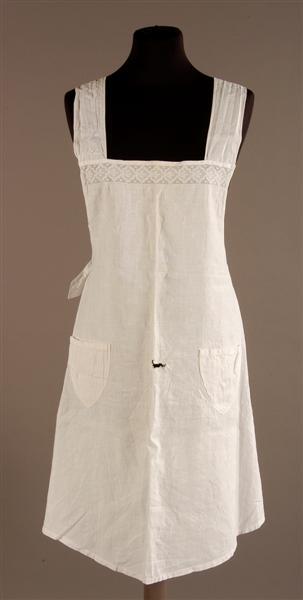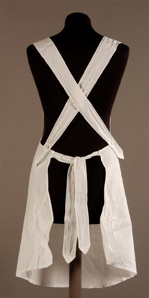 - BeschrijvingWit katoenen schortje. Geen horizontale taillenaad. Langs de bovenrand een strook machinale kant. Daaronder enig machinaal borduurwerk (lijnen en stippen). 2 opgestikte schildvormige zakjes. Rondgeknipt aan de onderkant. Bovenaan 2 banden met verstevigde knoopsgaten, te bevestigen aan de witte glazen knoopjes. Aan beide zijkanten een strikband