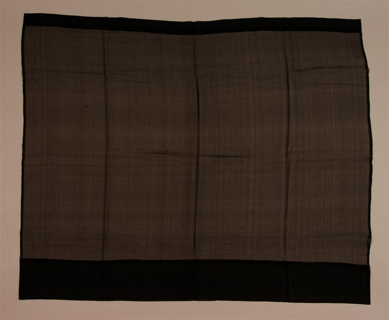- BeschrijvingRouwvoile van zwarte viscoserayon, geweven in platbinding met afwisselend 25 en 22 gedraaide crepe-garens in ketting en inslag. De lange zijden worden gevormd door de zelfkanten, de korte zijden zijn omgezoomd