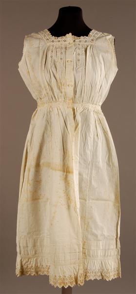 Wit katoenen onderjurk. Lijfje aan de voorkant gerimpeld. Vierkante hals, aan de voorkant afgezet met broderie-anglaise kant. Middenvoor, vanuit de halslijn 4 korte, vertikaal opgenaaide kantjes. Armsgaten afgewerkt met geschulpt band. Rugzijde glad, halslijn afgezet met geschulpt band. Onder in het rugpand een horizontale opnaad die doorloopt tot in het voorpand en daar de funktie van coupenaad krijgt. Gerimpelde aangezette 5-baans rok. Boven de zoom een geplooid aangezette strook broderie-anglaise kant. Op de aanzetnaad een fantasie bandje. Boven de strook 2 opnaden. Middenvoor een split in het lijfje, doorlopend tot in de rok, te sluiten met 4 parelmoeren knoopjes en 4 knoopsgaatjes. Aan de binnenzijde op de taillenaad een dubbelgevouwen strook katoen.