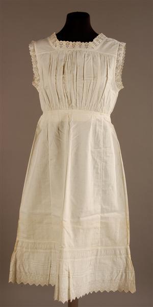 Wit katoenen onderjurk. Lijfje aan de voorkant gerimpeld. Vierkante hals en armsgaten, afgezet met broderie-anglaise kant. Glad rugpand. nder in het rugpand een horizontale opnaad die doorloopt tot in het voorpand en daar de funktie van coupenaad krijgt. Het lijfje is gerimpeld aan de rok gezet. Vijfbaans rok, glad aan het lijfje gezet (wel enkele coupenaden). Boven de rokzoom een gerimpeld opgezette strook broderie-anglaise kant. Boven de strook een glad aangezette entre-deux van broderie-anglaise kant. Onder de entre-deux een brede opnaad aan de binnenzijde van de onderliggende stof. Middenachter een split in het lijfje doorlopend tot in de rok, te sluiten met een witte glazen knoop en knoopsgat (in tailleband) en 4 koperen drukknoopjes. Aan de binnenzijde, op de taillenaad een dubbele strook katoen.