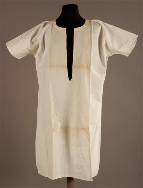 - BeschrijvingWit katoenen hemd. Ronde hals, aangeknipte korte mouwtjes, gerend gesneden zijnaden. Lang split middenvoor, onderaan verstevigd met een ingenaaid opengewerkt spinnetje. Wordt onder het korset gedragen