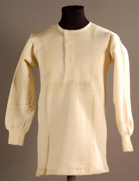 Ongebleekte katoenen borstrok van gemoltoneerde tricot met lange mouwen, maat 6. Ronde halsuitsnijding in het rugpand verstevigd met een halfcirkelvorm ingenaaid stukje tricot. Split middenvoor met beleg van ongebleekte katoen, te sluiten met 3 kunststof knoopjes en 3 knoopsgaten. Schuine armsgaten. Licht gerende zijnaden. Mouwen met kleine kop en aangenaaide dubbele manchetten.