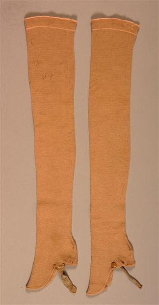 - BeschrijvingBeige wollen slobkousen. Bovenaan dubbel boordje met 2 ingebreide rose ringels. Echte naad en echt geminderd op kuithoogte. Hielvorm in model geknipt (dus niet gemeerderd!). Aan de onderzijde souspieds van beige elastiek met bruine drukknopen