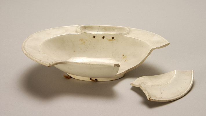 - BeschrijvingWitte ovaalvormige, vrij diepe schotel met standring en smalle rand. In de lange zijden van de rand een 10 cm lange uitsparing aan de ene zijde, een 8 cm lange verdieping met drie uitlekgaatjes aan de andere zijde.