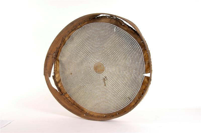 - BeschrijvingRond gebogen beukespaan, bespannen met een van een regelmatig gatenpatroon voorzien stuk perkament, vastgezet met ijzerdraad. In een centraal medaillon geperforeerd: H COPPENS 1848. (Is volgens v.d. Poel (1983) de maker, niet de eigenaar).