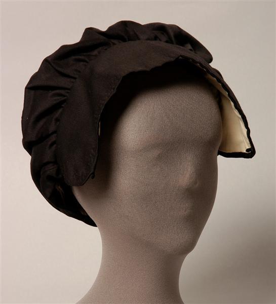 - BeschrijvingZwarte merinos ondermuts met breed schildje (7.5 cm). Koordjes geregen door de zoom van de bodem. Gevoerd met witte katoen. Tussenvoering papier? Aan de ronding van het schildje, aan beide zijden, een klein zwart lusje (voor bevestiging van de oorbellen). In 1986 ongenummerd aangetroffen. Zie ook inv.nr. 9849 A.