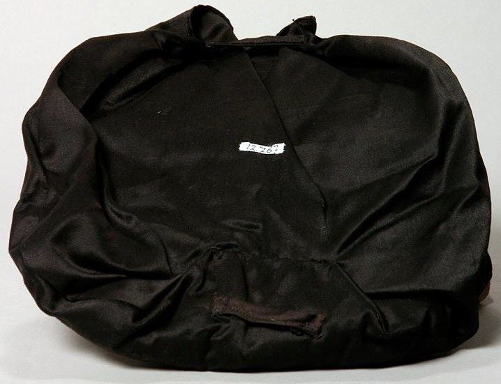 - BeschrijvingZwart satinet kussentje. Aan een zijde omgeslagen en vastgenaaid. Op de omslag een lusje. Aan de tegenoverliggende zijde een lusje dat de rand van het kussentje samentrekt. In 1986 ongenummerd aangetroffen.