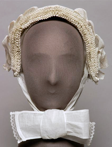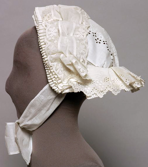 Muts van wit neteldoek. Aan de voorzijde 3 geplooide dakpansgewijze over elkaar gelegde stroken. De voorstroken zijn op een pas van neteldoek genaaid. De pas heeft middenvoor een plooitje en dientengevolge een naar voren uitstekende punt (niet erg scherp!). Bodem van broderie, met de geborduurde baan vertikaal in het midden. Over de voorstroken en de pas een brede strook neteldoek, afgezet met machinale kant, aan beide zijden in vier lussen vastgezet. Middenboven met scherp ingestreken vouw (misschien hoort hier oorspronkelijk wel een plooitje aan de voorzijde te zijn genaaid). Dubbele achterstrook (luifke). De bovenste is van broderie en in stolpplooien opgenaaid, de onderste van neteldoek, afgezet met een smal machinaal kantje en in smalle platte plooitjes opgenaaid. Onderrand van de bodem verstevigd met keperband. Striklinten van neteldoek, aan de onderkant afgezet met een smal kantje, aan de bovenkant van het mutsje genaaid. In 1986 ongenummerd aangetroffen.