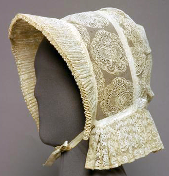 Zgn. neepjesmuts. Brede geplooide voorstrook van machinale kant. Plooien verstevigd met karkas. Voorstrook gezet aan brede band van geborduurde tule. Bodem van dezelfde geborduurde tule. Borduurwerken: rozetten in plumetiswerk. Rozetten ter grootte van guldens. Langs de onderrand van de muts een brede grof geplooide strook van dezelfde kant als gebruikt voor de voorstrook. Plooien bijeen gehouden met een doorgeregen draad. Naden aan de binnenzijde verstevigd met smal katoenen band. Door de zoom van de onderkant van de bodem zijn 2 katoenen bandjes geschoven. Striklinten van katoen.