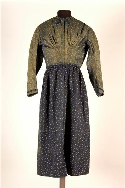Blauw schootjak (jurk?). Lichtglanzende katoen, bedrukt met klein bloemmotief. Lijfje middenvoor gesloten met 10 haken en ogen. In het voorpand, onder de borst, ingestikte plooitjes. In het rugpand dezelfde plooitjes. Rok middenvoor open zonder sluiting. Gerimpeld strookje stof langs hals vastgezet op lijfje. Witte katoenen voering in lijfje. Borduurwerk op mouwen. In 1986 ongenummerd aangetroffen. Zie ook inv.nr. 8782.