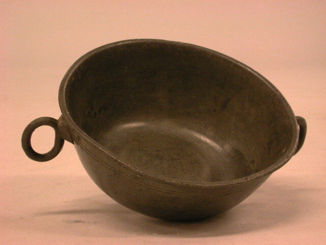 - BeschrijvingHollandse zgn. 'oorkom'. Strak bakje met twee aangezette ronde oren. Enkele gedraaide ringen langs de bovenrand. Onder op de bodem het oude inv.nr. in witte verf 42.