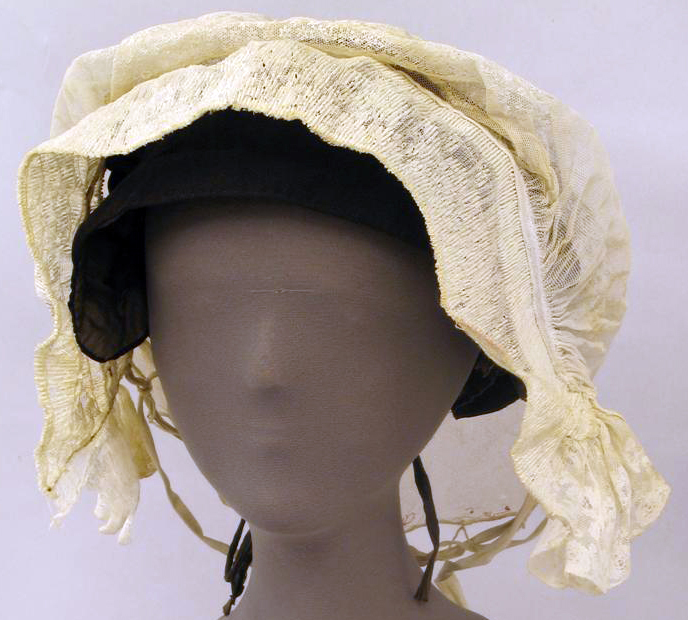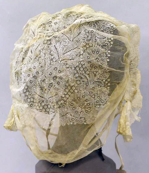 Witte katoenen muts met geplooide voorstrook van gedeeltelijk dubbelgevouwen Mechelse kant met ijsgrond (waarschijnlijk echt). Smal schildje (ca 1 cm breed) van tule op gaas. Tulen bodem versierd met platwerk in eenbloemig patroon. Aan de onderkant van de bodem zijn lussen van koord genaaid waardoor 2 bandjes geschoven zijn. Op de achterzijde van het dubbele gedeelte van de voorstrook is een reep gaas meegeplooid. Daarop is ter hoogte van de oren ter versteviging sutiƫnband genaaid. Plooien 3 maal doorgeregen en 5 maal over de gehele lengte van de voorstrook vastgenaaid. De kant loopt aan beide zijden onder het geplooide deel waaiervormig uit. Hoogte plooien 0.2 cm. Ca 70 plooien/10 cm. Breedte strook 9-10 cm.