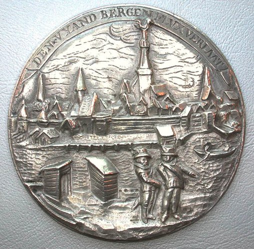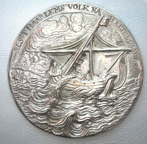 Op de voorzijde het gezicht op de stad Hasselt, met twee wachtposten op de voorgrond; op een banderol boven de voorstelling een opschrift. Op de keerzijde een zeilschip met het garnizoen van Haarlem op de Zuiderzee. Op een banderol boven de voorstelling een opschrift.