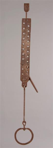 - BeschrijvingGrote ketelheffer. Een wartel en kast met twee geperforeerde platen die aan elkaar zijn gesmeed. Glijstang tussen de platen naar boven of beneden verschuifbaar, het onderste einde vormt een ketelhaak. Een hefboom (verbonden aan glijstang) en twee pennen bepalen de hoogte van de haak.