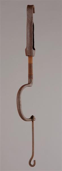 - BeschrijvingDraaibare driedelige ijzeren ketelheffer. Gebogen handvat met recht onderstuk, voorzien van schroefdraad. Open hals (schroefdraad) die uitloopt in een ketelhaak.