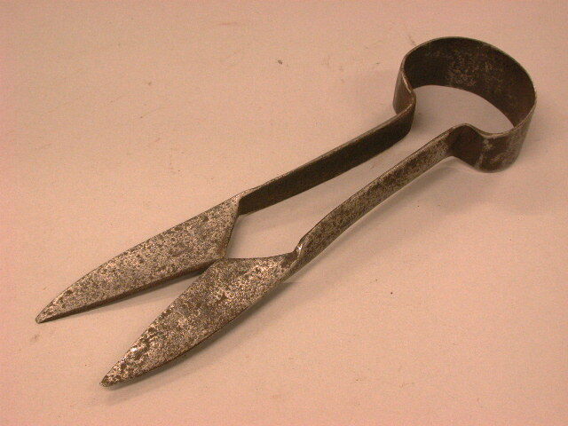 - BeschrijvingEƩndelige schaar. Lange, platte, haarbladen (hoekige omtrek) met stevige ronde stalen en een platte kromme veer.