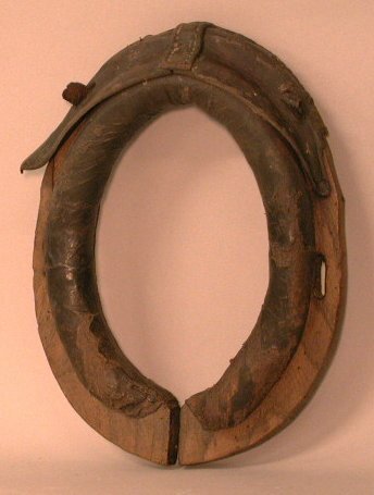 - BeschrijvingHoefvormig houten frame met leren bekleding (zonder gespen) het frame is niet geheel bekleed. Koperen naamplaatje met inscriptie. Juk voor honden.