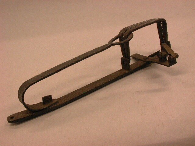 - BeschrijvingIJzeren klem vorm: 2 gekartelde en hoekige klemdelen ("vierkant") rechthoekig lokaasplaatje? Mechanisme: afstelling door middel van een pal.
