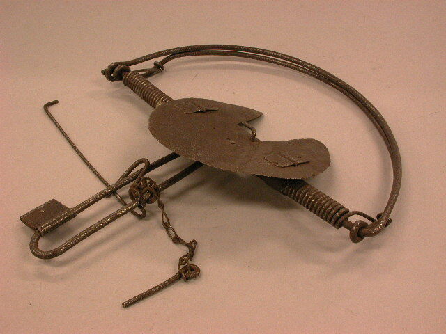 - BeschrijvingIJzeren ganzenklem. Twee grote klembogen met een hoefvormige lokaasplaat met een hechtpin voor het lokaas. Centraal veermechanisme.