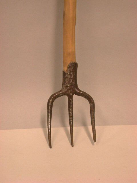 Drietandig voorwerp waarvan de tanden iets gebogen, hoekig en ongelijk van lengte zijn. Dichtgesmede huls.