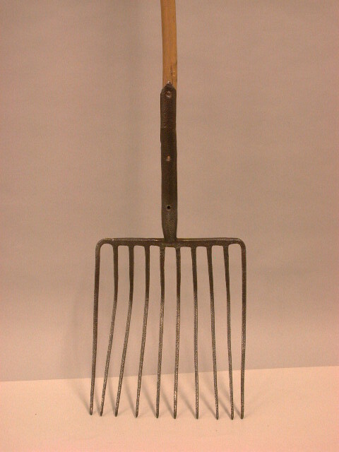 - BeschrijvingEen riek met tien tanden die m.u.v. de twee buitenste flauw gebogen zijn met twee slippen als huis die elk van drie nagelgaten zijn voorzien.