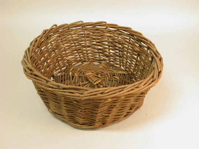- BeschrijvingRonde mand gemaakt van ongeschilde wilgetenen, met een opgehoogde bodem. De mand heeft geen hengsels.