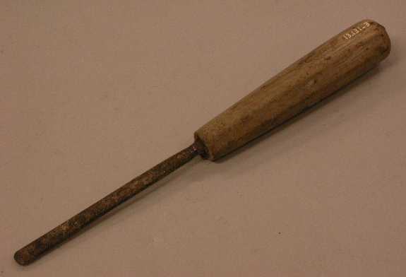 - BeschrijvingBeitel met schuin snijvalk (vouw en snede). Nek, borst en angel die deels (0,5 cm zichtbaar is). Achthoekig gesneden handvat (vroeger misschien voorzien van ophangoogje). Om smalle gaten en sleuven te maken in hout (naar houtverbindingen)met grove voordraaiwerk.