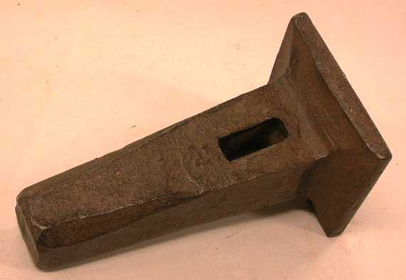 - BeschrijvingEen hamerkop van een zethamer. Een vierkant plat vlak met een zware, tapse en stompe punt waarin een zijwaarts rechthoekig gat zit.