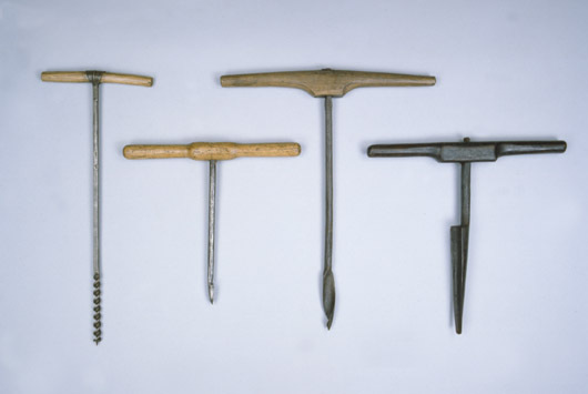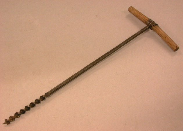 - BeschrijvingDubbelgangige slangenboor met schroefspits en voorsnijders. Een vierhoekige steel, waarop 80 (?) staat gestempeld, loopt uit in een horizontale huls met een houten handvat (niet origineel).